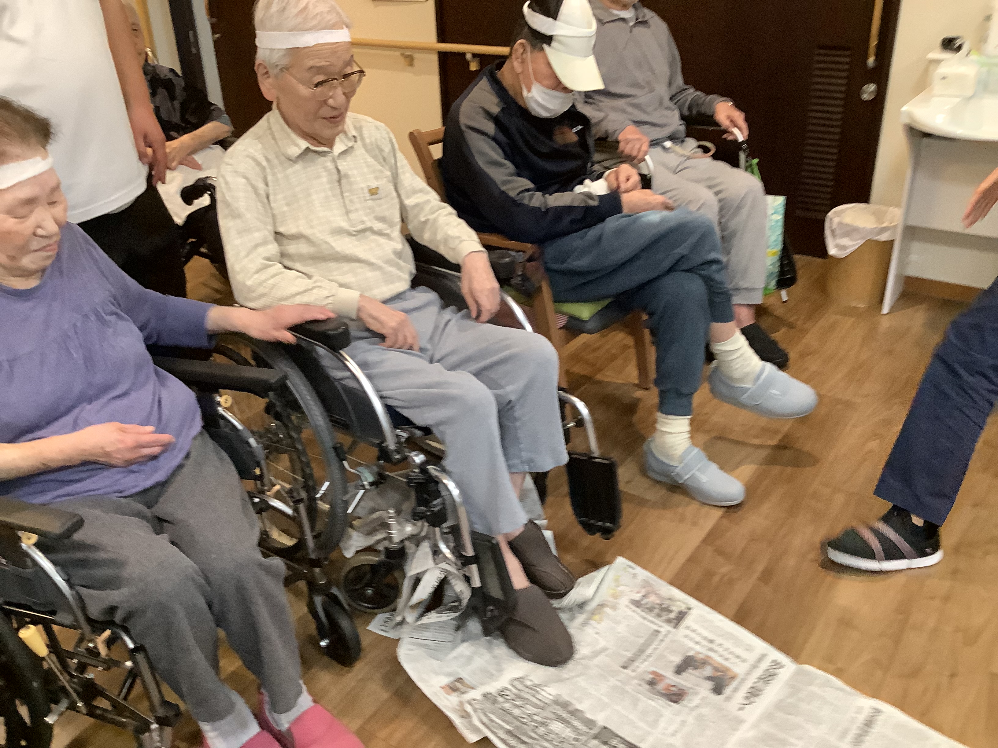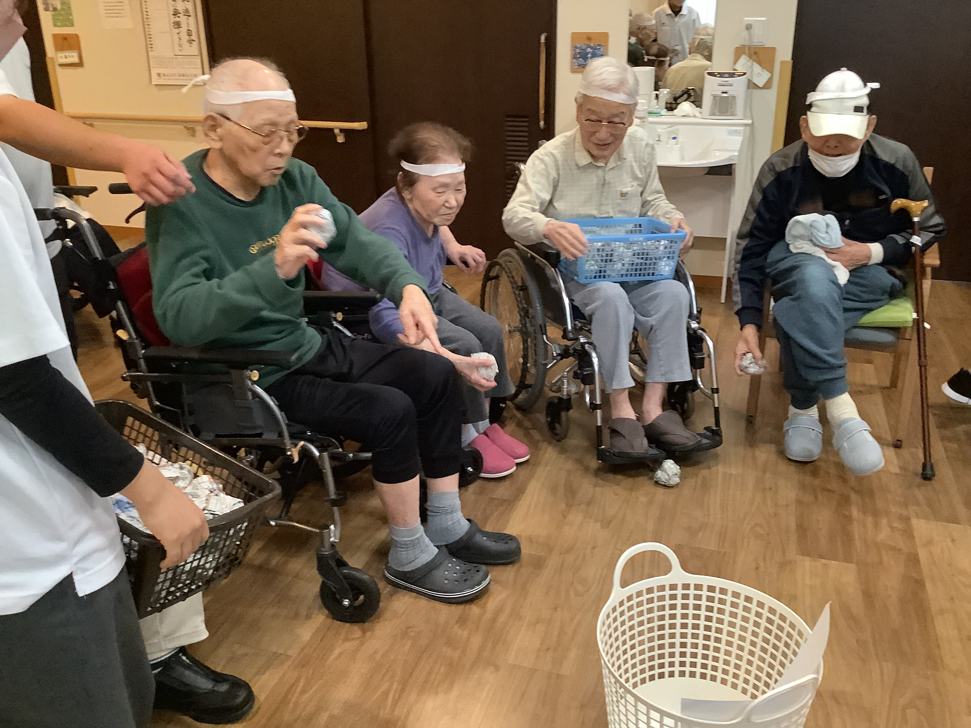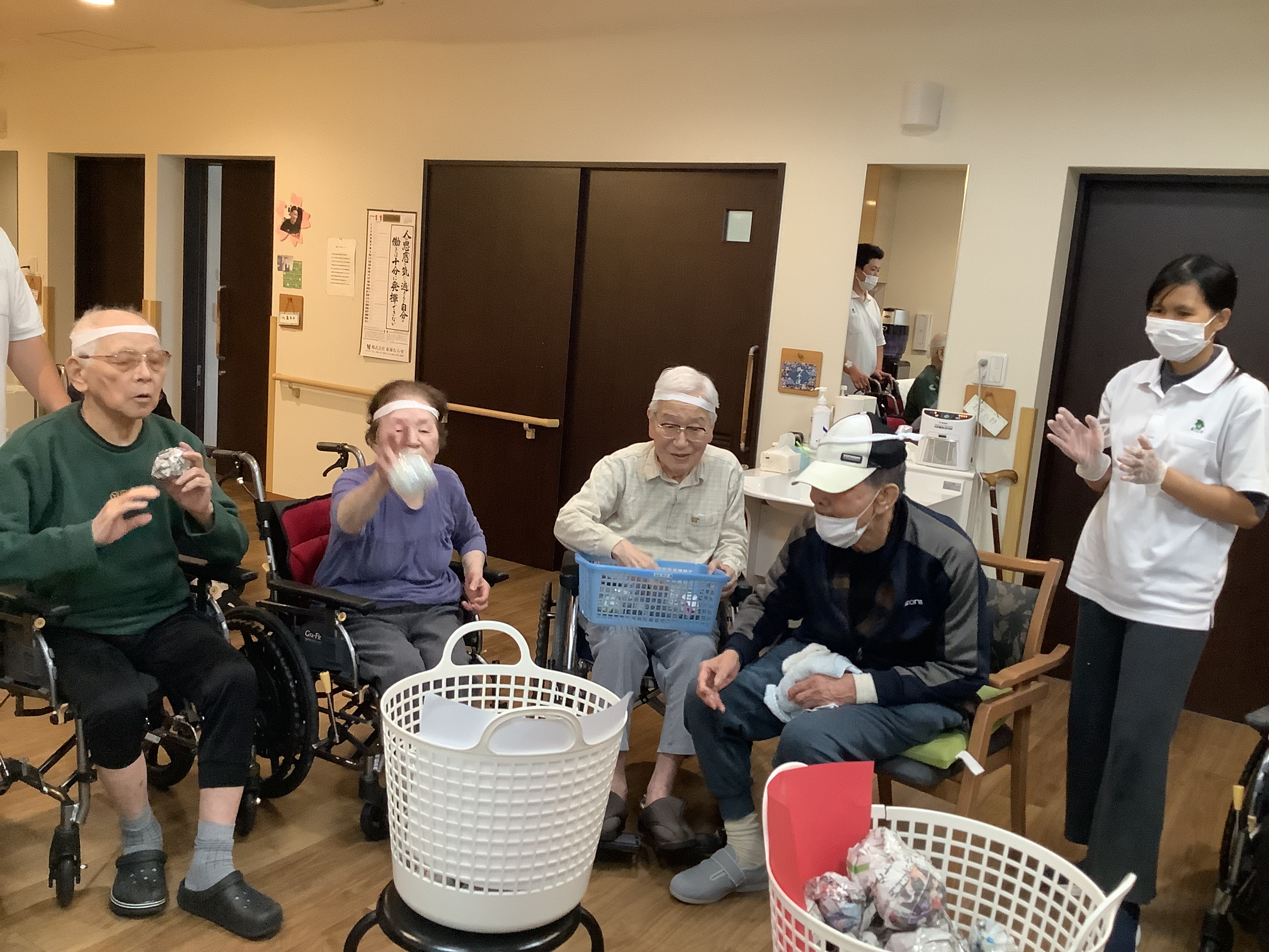 こんにちは😃11/19日に3・4番街のプチ運動会❓をしました。😀 3番街、4番街でチームを分けて最初は紙⚽️をカゴに投げて入れてもらっています。4番街チームはカゴに入れるが上手でした😄。3番街チームも最後まで諦めずにカゴめがけて投げ入れていました。😄次の競技は足で新聞を踏み早く自分の元へ引き寄せる競技です。こちらの競技では自分の順番を待たずに始めてしまうハプニングもありましたが、その時には職員も他の利用者様も「まだ早いよ」🤭と笑顔になって😂笑い声が絶えず出ていました。