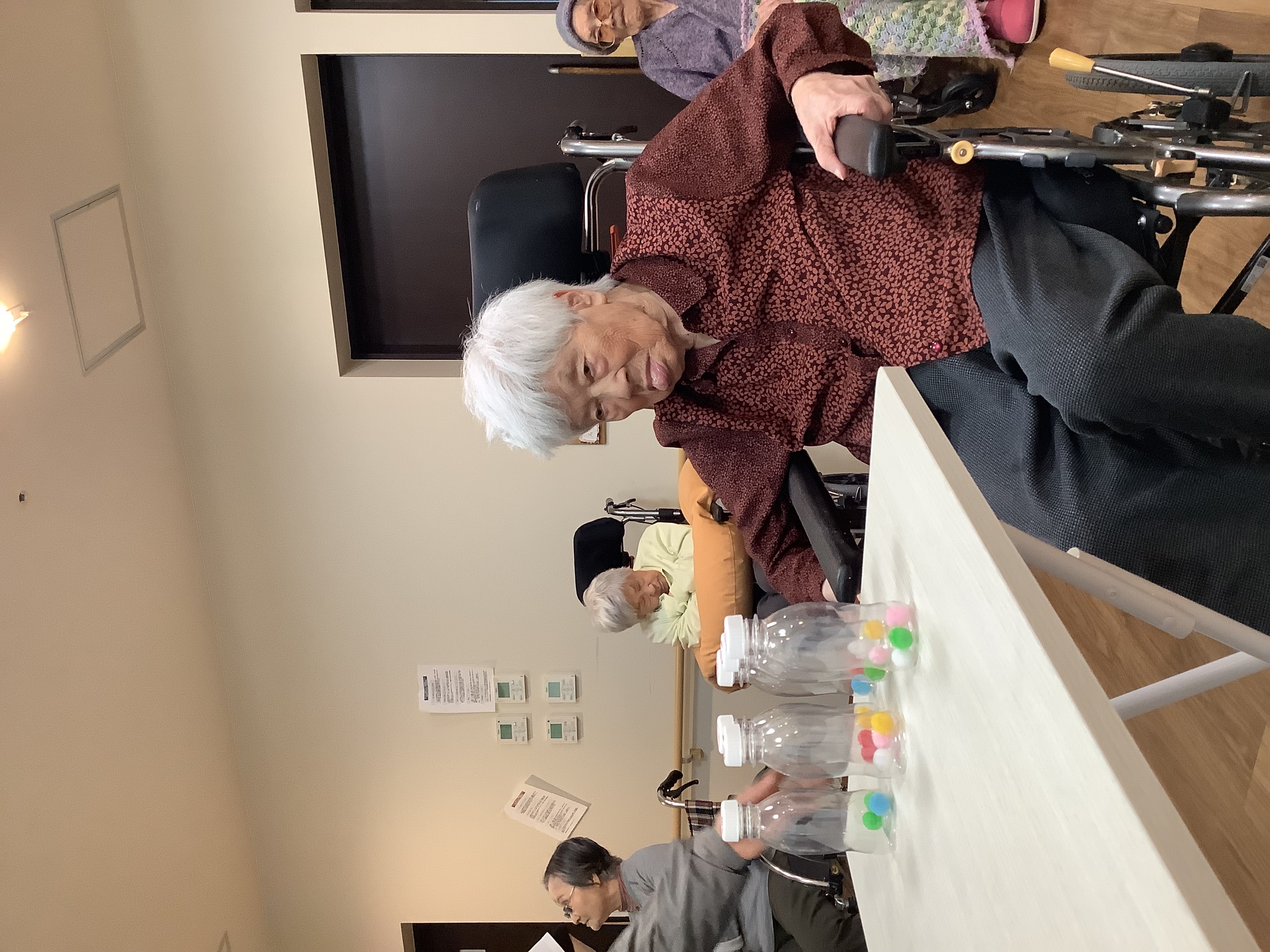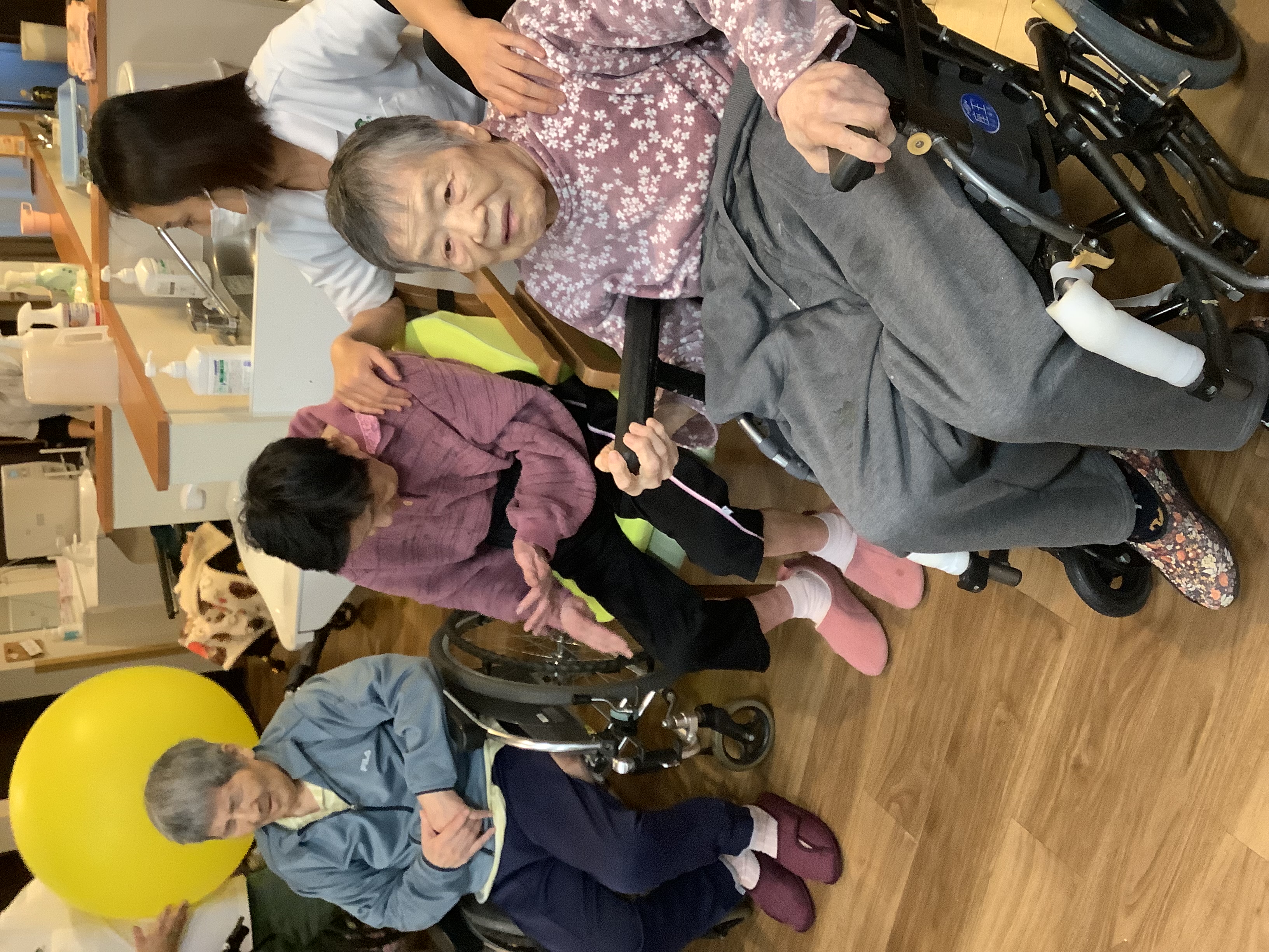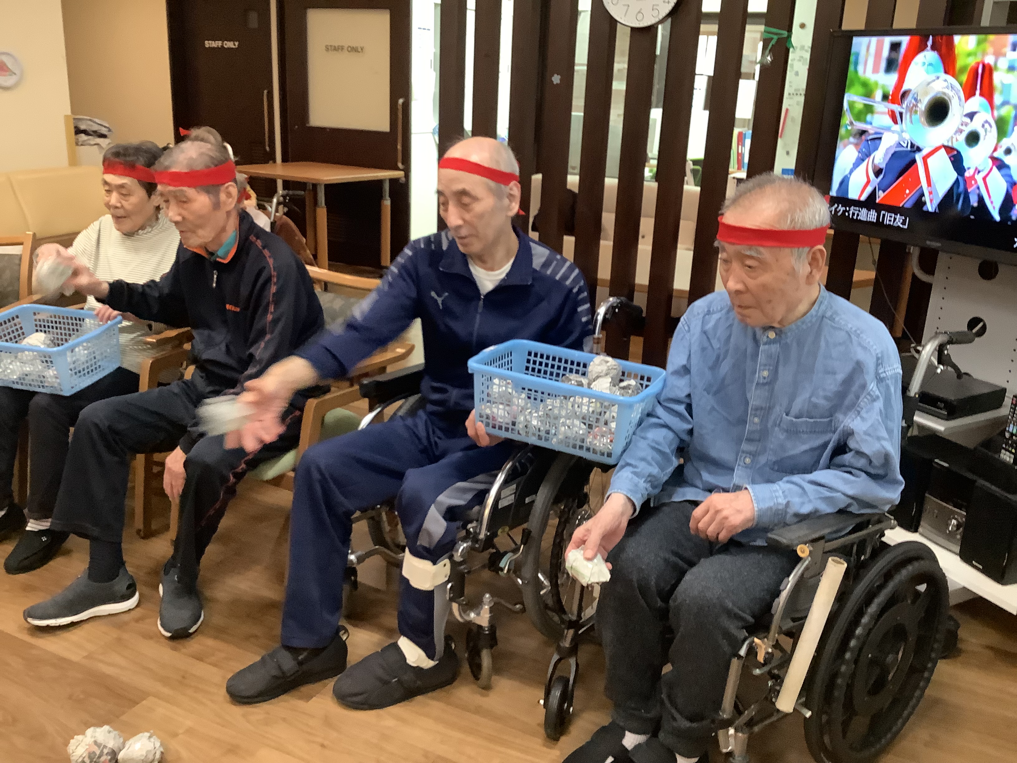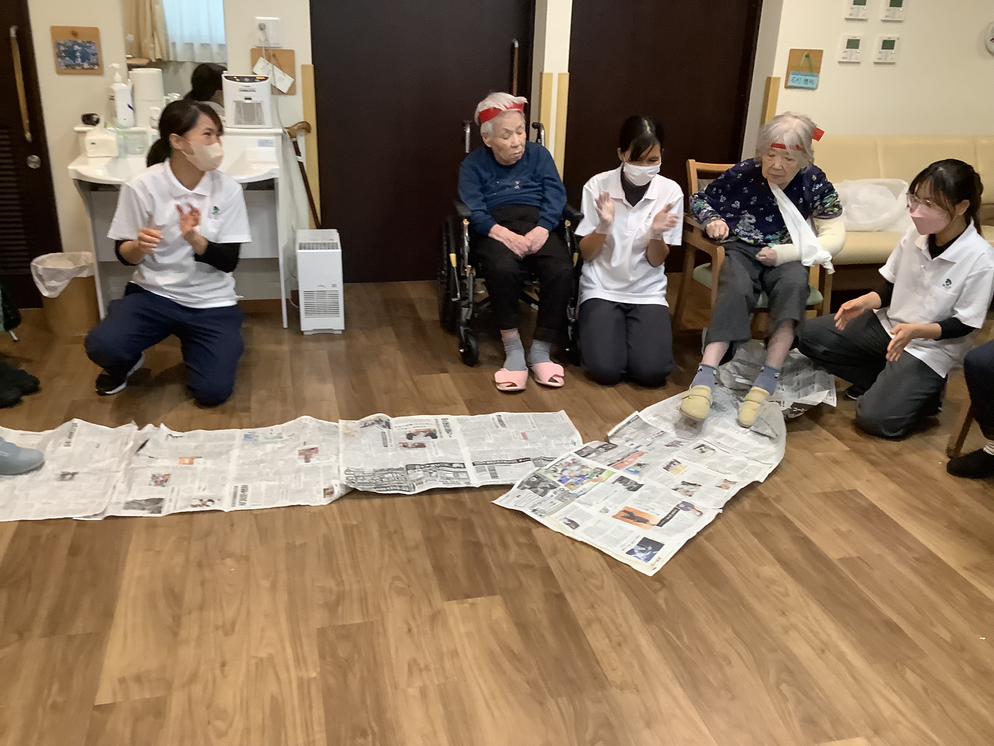 こんにちは😃11/19日に3・4番街のプチ運動会❓をしました。😀 3番街、4番街でチームを分けて最初は紙⚽️をカゴに投げて入れてもらっています。4番街チームはカゴに入れるが上手でした😄。3番街チームも最後まで諦めずにカゴめがけて投げ入れていました。😄次の競技は足で新聞を踏み早く自分の元へ引き寄せる競技です。こちらの競技では自分の順番を待たずに始めてしまうハプニングもありましたが、その時には職員も他の利用者様も「まだ早いよ」🤭と笑顔になって😂笑い声が絶えず出ていました。