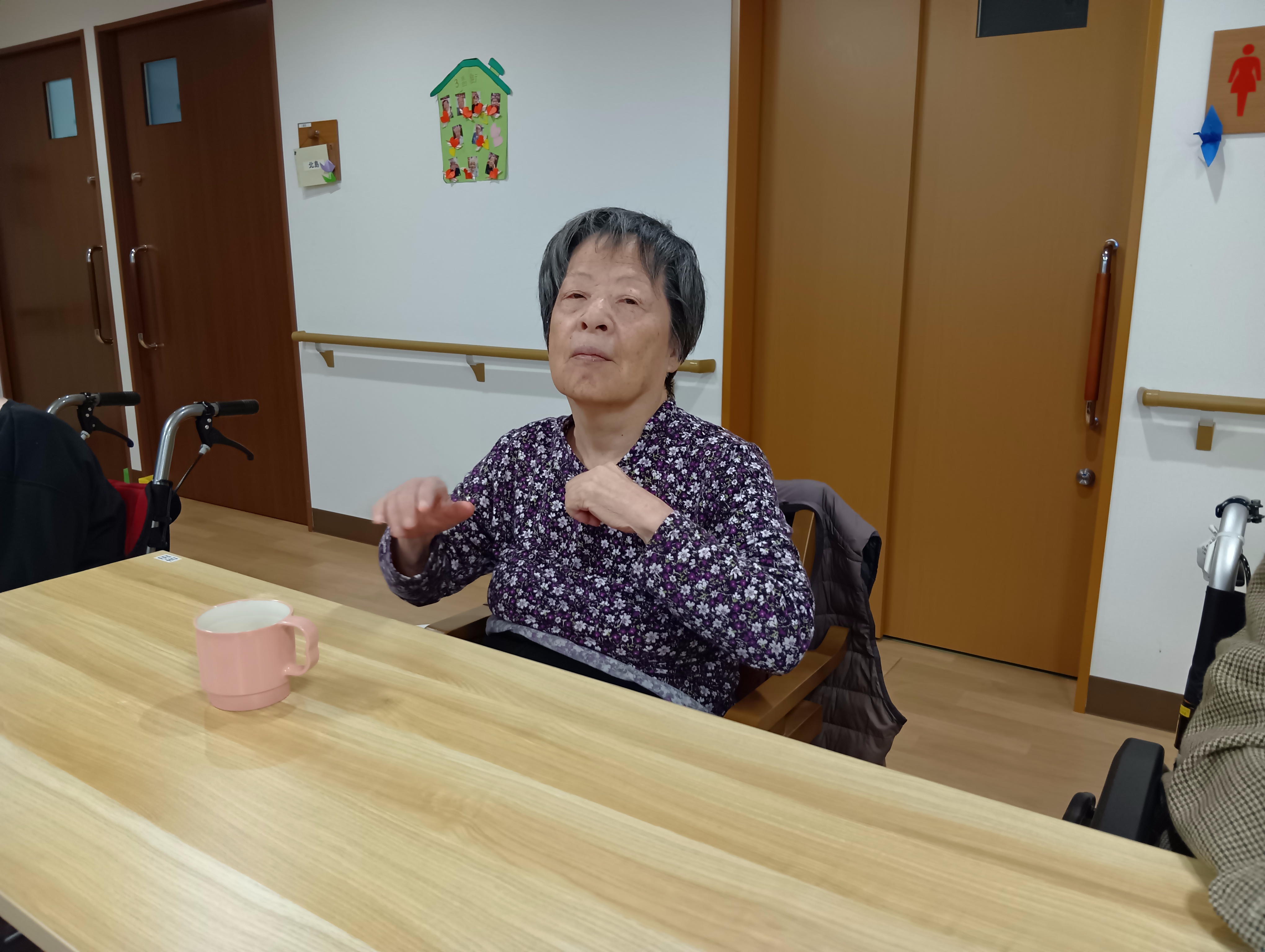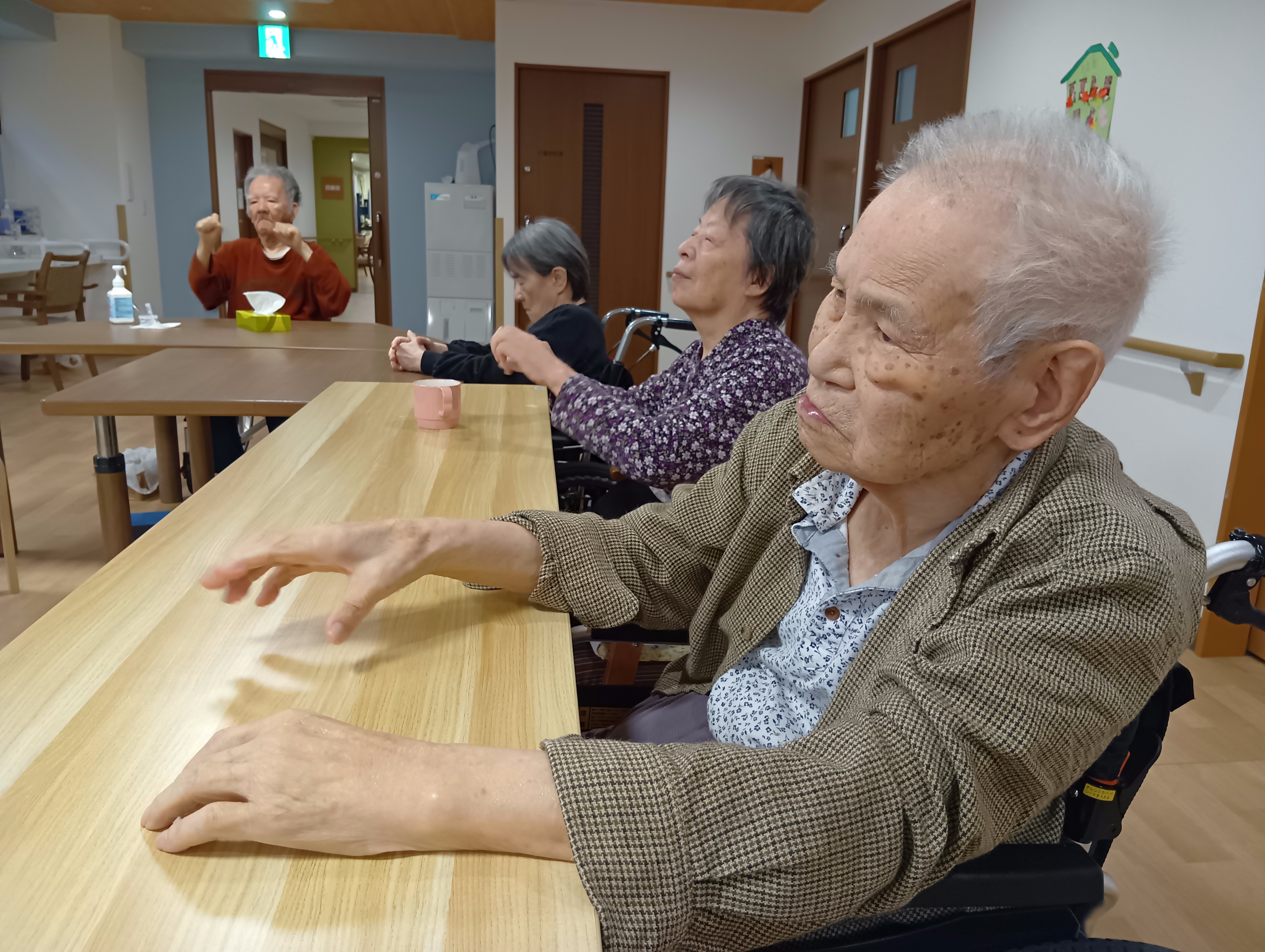 今日は2階の3番街にお邪魔しまして、みなさんで食事前の体操をしました。