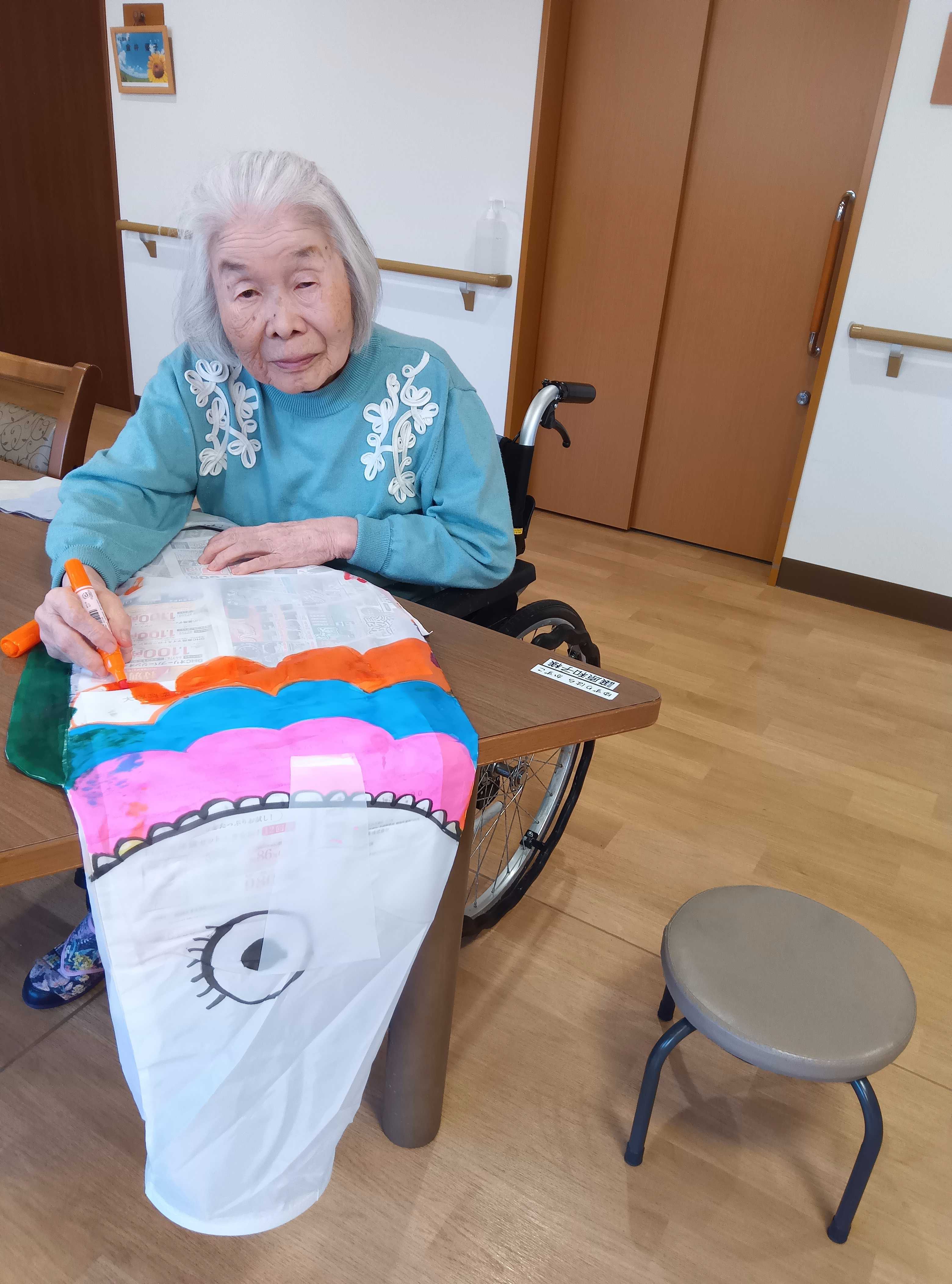 もうすぐ5月5日端午の節句ですね🎏5階12番街の利用者様はお絵描きがお好きなようでお願いしましたら笑顔で快く「いいわよ♡」と。カラフルなこいのぼり🎏出来上がりが楽しみです♪5階 M